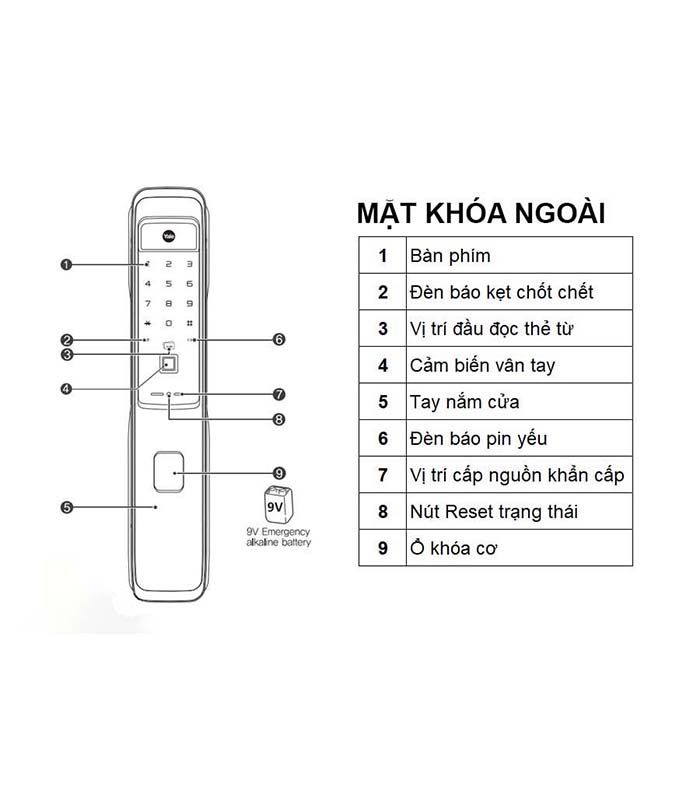| Chức năng mở cửa | Vân tay, Thẻ từ, Mã số PIN, Chìa khóa cơ |